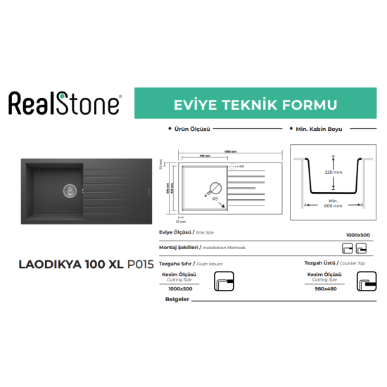 REALSTONE P015 LAODİKYA 100 XL TEK GÖZLÜ VE DAMLALIKLI XL GRANİT EVİYE